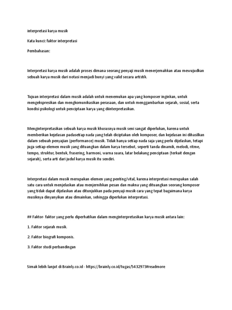 Interpretasi, menafsirkan, dan memaknai sebuah lirik lagu secara mendalam beserta terjemahanya Pengertian interpretasi menurut para ahli. Interpretasi adalah milik pribadi, sehingga kita tidak perlu dan tidak bisa memaksakan interpretasi kita kepada orang lain. Interpretasi sangat berkaitan dengan jangkauan yang harus dicapai oleh subjek dan pada waktu yang bersamaan juga diungkapkan kembali. Membimbing pengunjung dalam mengembangkan kesadaran, apresiasi dan pemahaman yang lebih tajam mengenai area yang dikunjunginya. Oleh karena itu, ini juga dapat dikatakan sebagai penjelasan dari komunikasi lisan, atau dapat dikatakan sebagai. Pengertian menurut ahli, tujuan, prinsip, program dan tahapannya. Untuk menemukan hukum, ada beberapa metode penemuan hukum, salah satunya adalah melalui interpretasi atau. Oleh karena itu, terdapat beberapa interpretasi untuk. Jumlah tertinggi adalah 15, sedangkan konsistensi dibawah 9 adalah meragukan dan tidak perlu di interpretasi. Menurut kaelan (1998) interpretasi adalah suatu seni yang menggambarkan komunikasi secara tidak langsung, akan tetapi komunikasi tersebut bisa dengan mudah dipahami. Kegunaan interpretasi adalah menjelaskan data dalam bentuk yang bisa dimengerti dan dapat dipahami orang lain. Itu adalah risiko yang tidak dapat ditanggung oleh ibu, saudara perempuan dan anak perempuan kita.